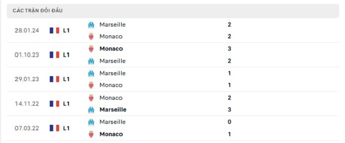 Bảng bóng đá trận đấu Marseille vs Monaco