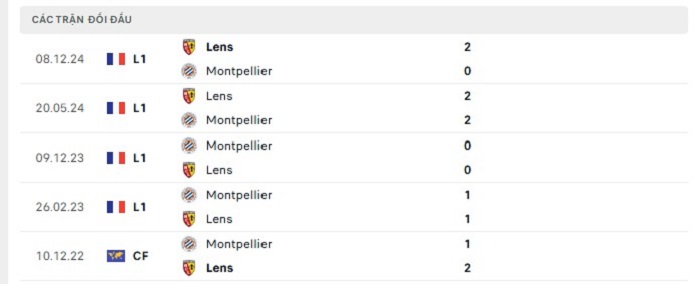 Lịch sử đối đầu của Montpellier vs RC Lens