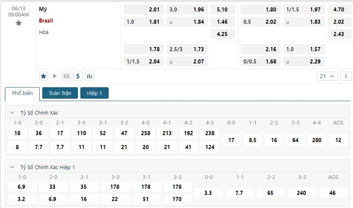Bảng tỷ lệ kèo bóng đá trận đấu Mỹ vs Brazil