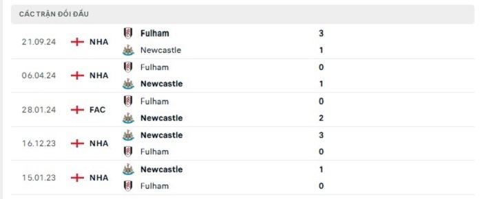 Lịch sử đối đầu của Newcastle vs Fulham