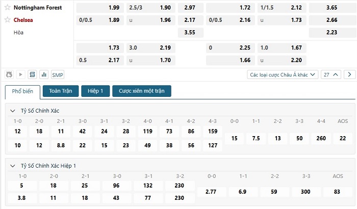 Bảng tỷ lệ kèo bóng đá trận đấu Nottingham vs Chelsea