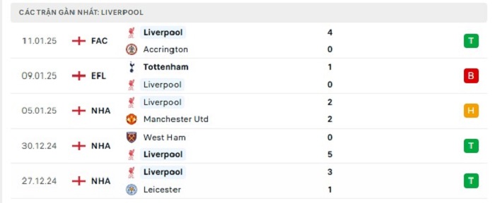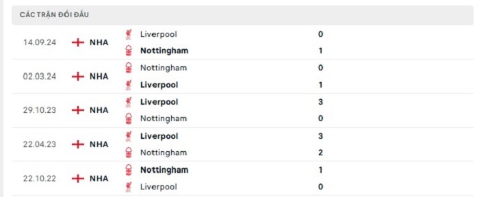 Lịch sử đối đầu của Nottingham vs Liverpool