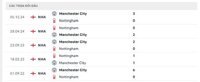 Lịch sử đối đầu của Nottingham vs Manchester City