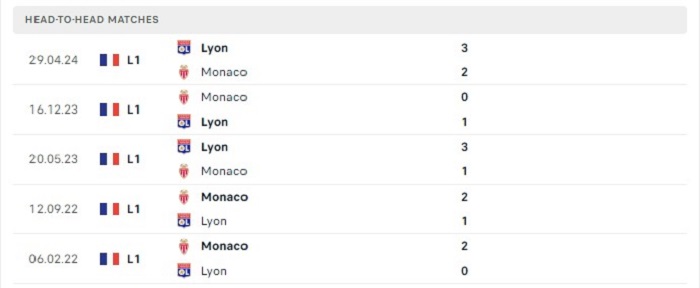 Lịch sử đối đầu của Olympique Lyonnais vs AS Monaco