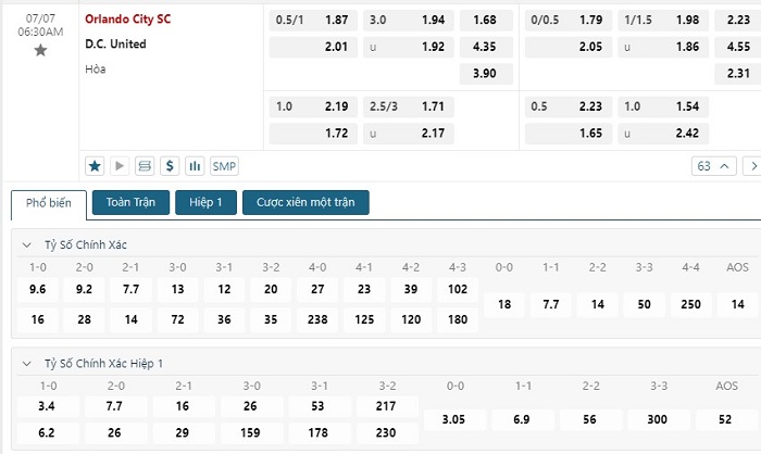 Bảng tỷ lệ kèo bóng đá trận đấu Orlando City vs DC United