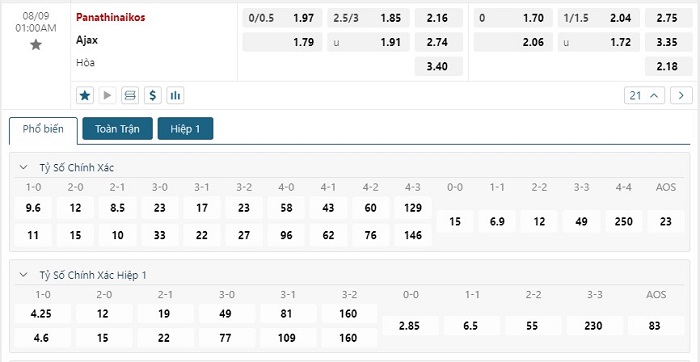 Bảng tỷ lệ kèo bóng đá trận đấu Panathinaikos vs Ajax Amsterdam