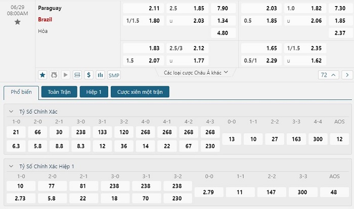 Bảng tỷ lệ kèo bóng đá trận đấu Paraguay vs Brazil