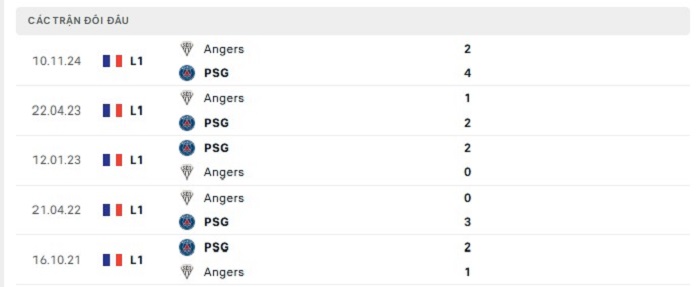 Lịch sử đối đầu của Paris Saint-Germain vs Angers