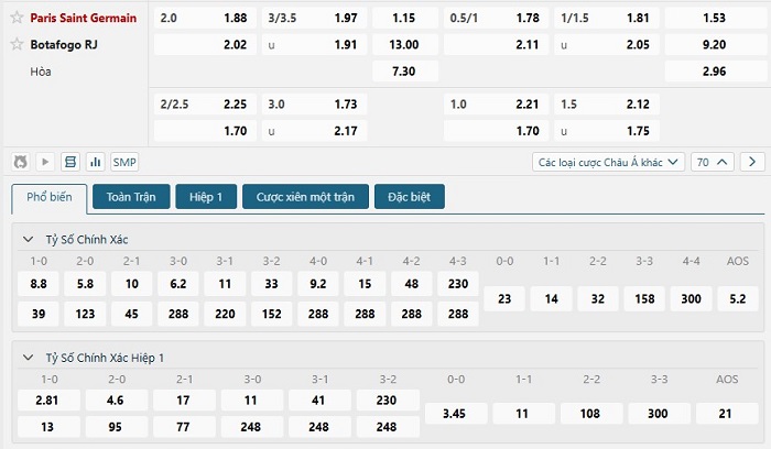 Bảng tỷ lệ kèo bóng đá trận đấu Paris Saint Germain vs Botafogo