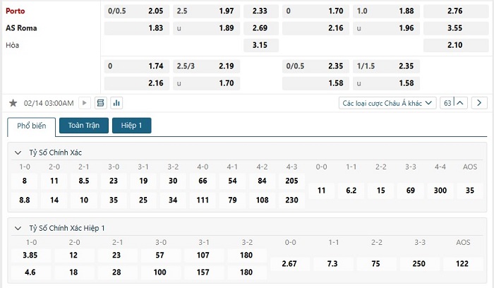 Soi kèo châu Á, kèo chấp Porto vs AS Roma