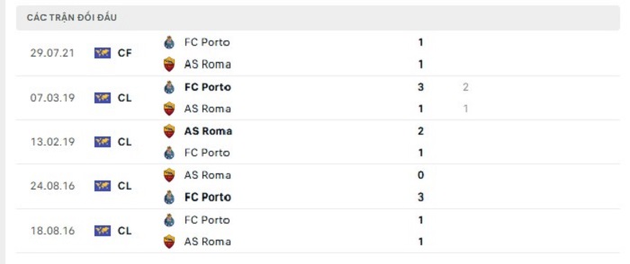 Lịch sử đối đầu của Porto vs AS Roma