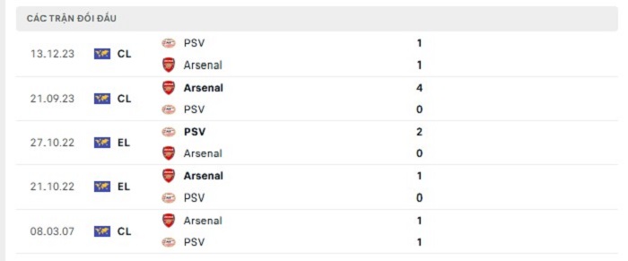 Bảng  bóng đá trận đấu PSV Eindhoven vs Arsenal