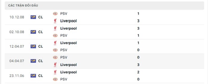 Lịch sử đối đầu của PSV Eindhoven vs Liverpool