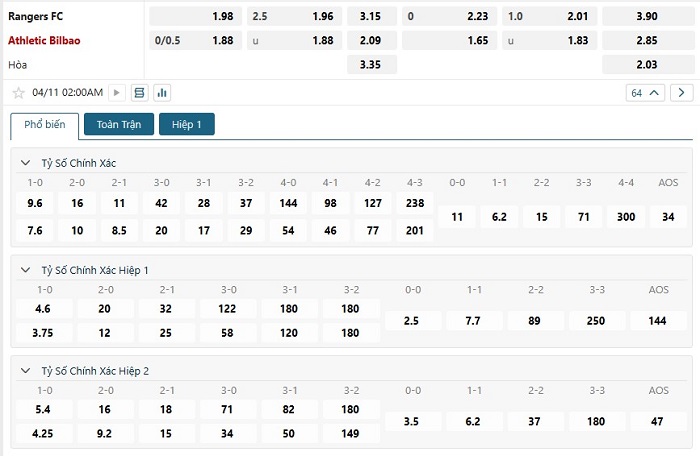 Bảng tỷ lệ kèo bóng đá trận đấu Rangers vs Athletic Bilbao
