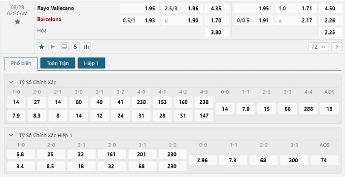 Bảng tỷ lệ kèo bóng đá trận đấu Rayo Vallecano vs Barcelona