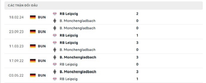 Lịch sử đối đầu của RB Leipzig vs Borussia Monchengladbach