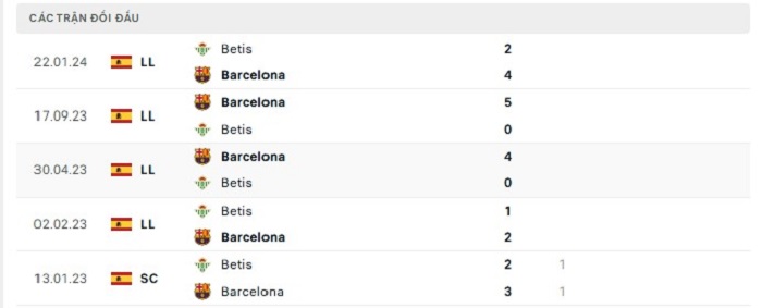 Lịch sử đối đầu của Real Betis vs Barcelona
