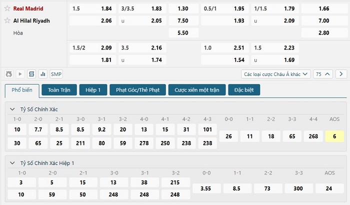 Bảng tỷ lệ kèo bóng đá trận đấu Real Madrid vs Al Hilal