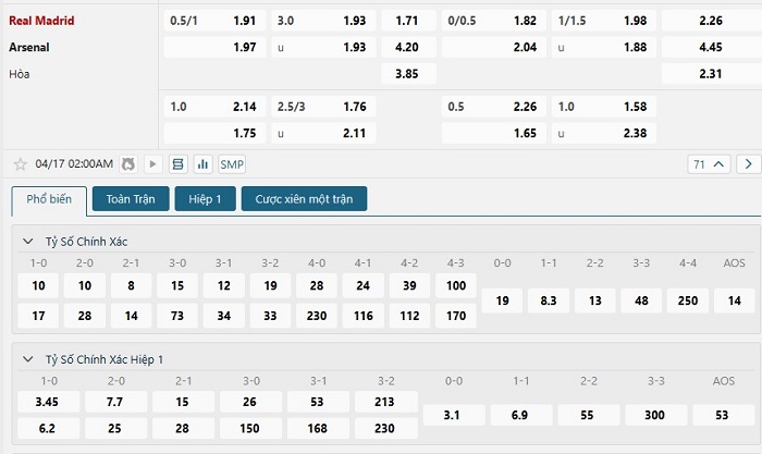 Bảng tỷ lệ kèo bóng đá trận đấu Real Madrid vs Arsenal