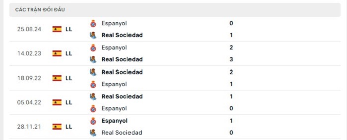 Lịch sử đối đầu của Real Sociedad vs Espanyol