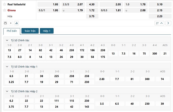 Bảng tỷ lệ kèo bóng đá trận đấu Real Valladolid vs Girona