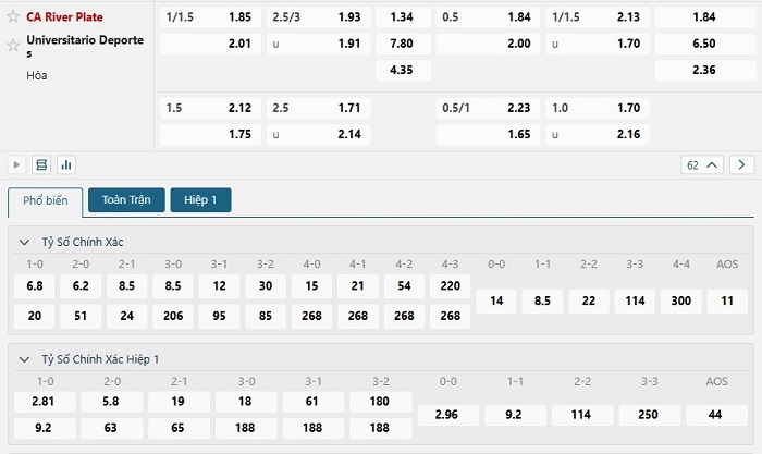 Bảng tỷ lệ kèo bóng đá trận đấu River Plate vs Universitario Deportes