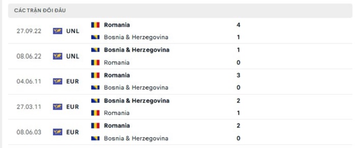 Lịch sử đối đầu của Romania vs Bosnia & Herzegovina