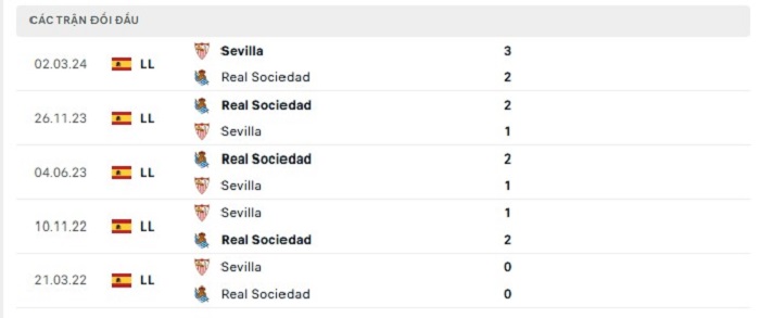 Lịch sử đối đầu của Sevilla vs Real Sociedad