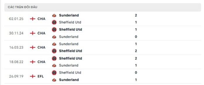 Lịch sử đối đầu của Sheffield United vs Sunderland