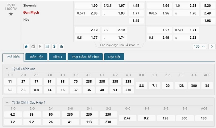 Bảng tỷ lệ kèo bóng đá trận đấu Slovenia vs Đan Mạch