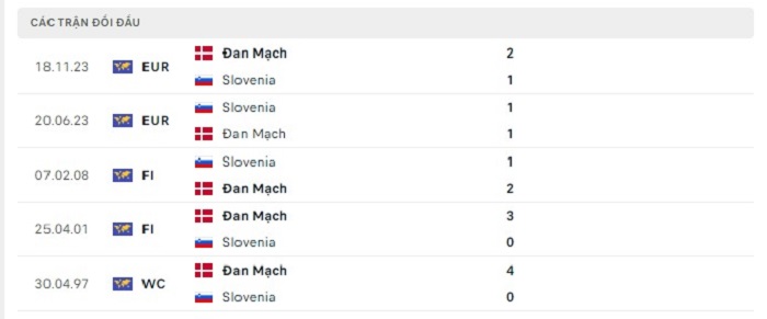 Lịch sử đối đầu của Slovenia vs Đan Mạch