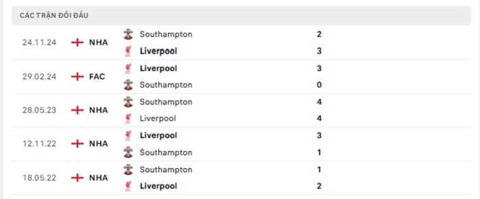Bảng bóng đá trận đấu Southampton vs Liverpool