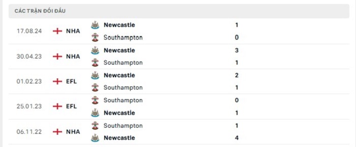 Lịch sử đối đầu của Southampton vs Newcastle