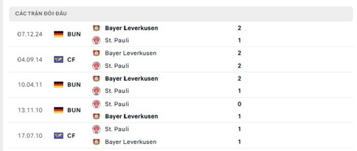 Lịch sử đối đầu của St. Pauli vs Bayer Leverkusen