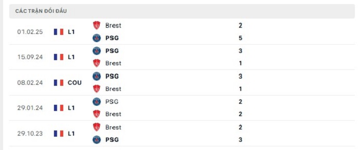 Lịch sử đối đầu của Stade Brestois vs Paris Saint Germain
