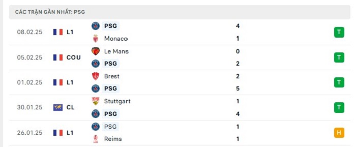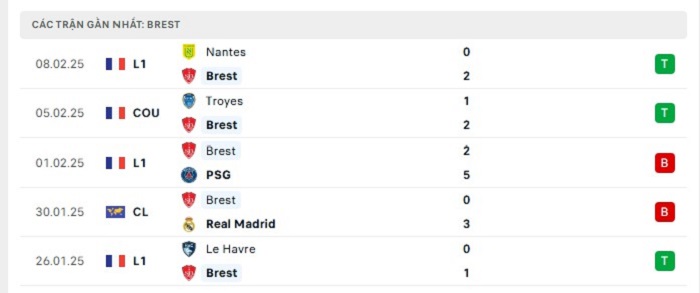 Phong độ gần đây Stade Brestois vs Paris Saint Germain