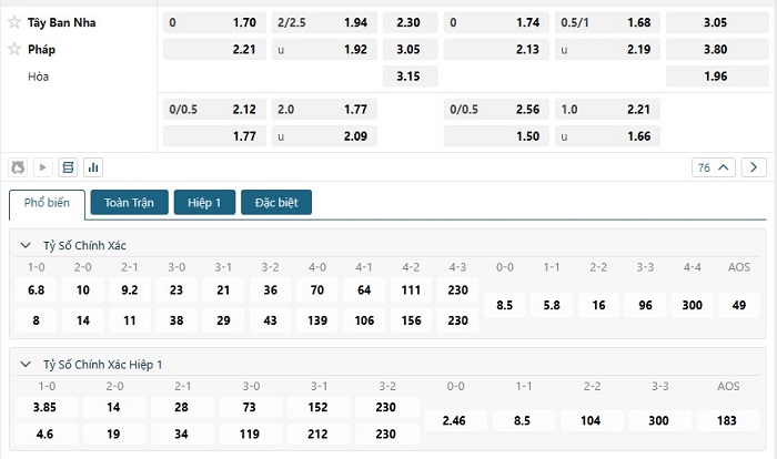 Bảng tỷ lệ kèo bóng đá trận đấu Tây Ban Nha vs Pháp