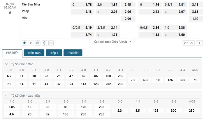 Bảng tỷ lệ kèo bóng đá trận đấu Tây Ban Nha vs Pháp