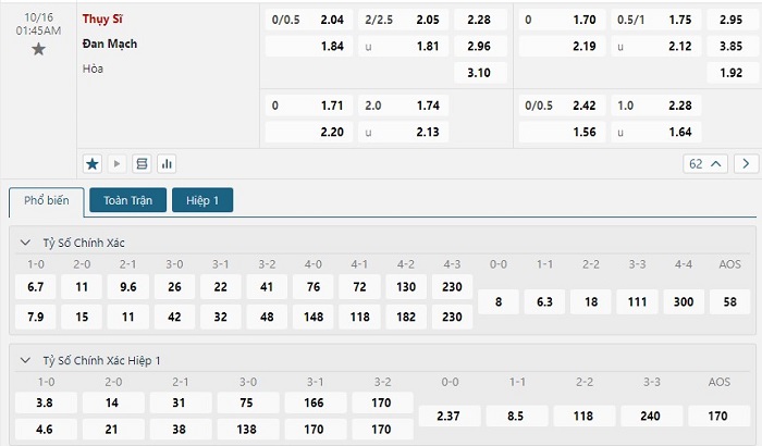 Soi kèo tỷ số Thụy Sĩ vs Đan Mạch