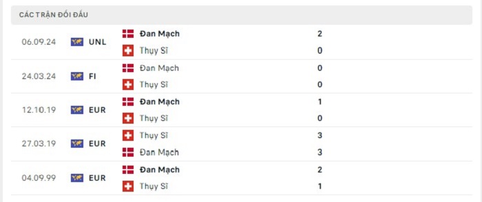 Lịch sử đối đầu của Thụy Sĩ vs Đan Mạch