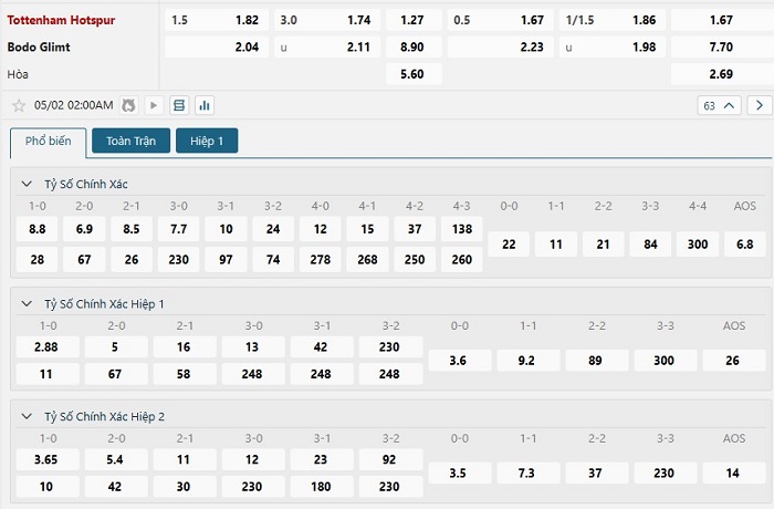 Bảng tỷ lệ kèo bóng đá trận đấu Tottenham Hotspur vs Bodo Glimt