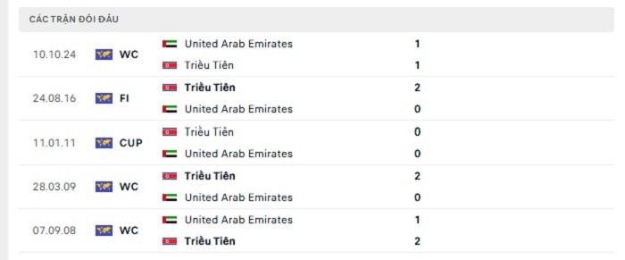 Thành tích trong quá khứ với Triều Tiên họ lại có được những thành công trước UAE, cụ thể là trong 7 lần gặp nhau trước đây giữa hai đội thì Triều Tiên thắng 3, hoà 2 và chỉ thua 2 trước đối thủ này theo mốc kèo châu Âu. Tại trận lượt đi của vòng loại này thậm chí trên sân nhà UAE cũng đã không thể đánh bại Triều Tiên cho thấy đây là đối thủ cũng không phải dễ dàng với họ, bởi vậy mà không loại trừ khả năng hai đội bất phân thắng bại theo kèo châu Âu của trận lượt về vòng loại World Cup khu vực châu Á lần này.
