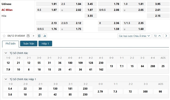 Bảng tỷ lệ kèo bóng đá trận đấu Udinese vs AC Milan