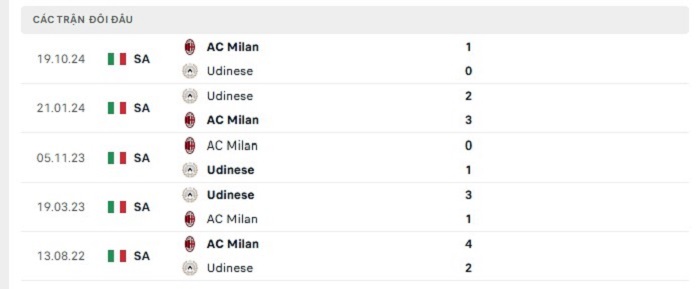 Trong quá khứ với Udinese họ cũng có những khó khăn trước AC Milan, thật vậy bởi 10 lần gặp nhau trước đây của hai đội thì đội chủ nhà chỉ thắng 2, hoà 3 và thua tới 5 trận đấu theo mốc kèo châu Âu được niêm yết, Giai đoạn lượt về này với Udinese thì phong độ của họ không được tốt như thời gian của giai đoạn lượt đi của mùa giải, do vậy mà dù đang có được những lợi thế về mặt sân nhà hiện tại nhưng xét về mặt thực lực mà nói với Udinese việc gặp những khó khăn trước AC Milan ở trận gặp nhau sắp tới cũng là điều có thể hiểu được.