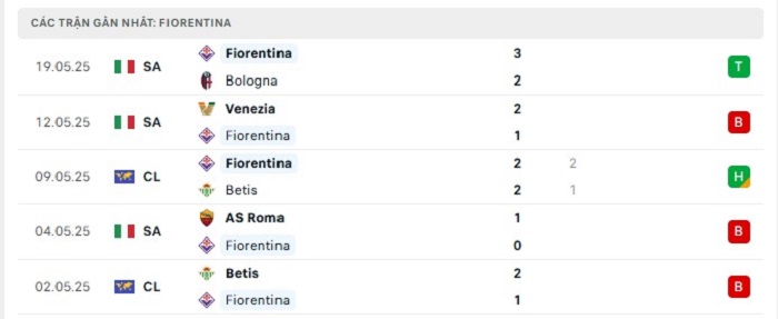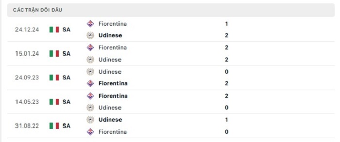 Lịch sử đối đầu của Udinese vs Fiorentina