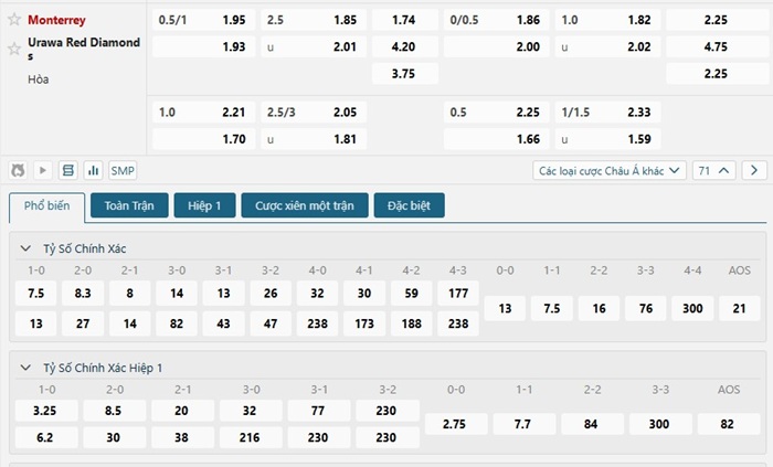Bảng tỷ lệ kèo bóng đá trận đấu Urawa Red vs Monterrey