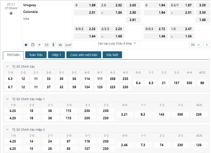 Bảng tỷ lệ kèo bóng đá trận đấu Uruguay vs Colombia