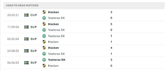 Lịch sử đối đầu của Vasteras vs BK Hacken