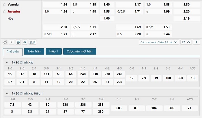 Bảng tỷ lệ kèo bóng đá trận đấu Venezia vs Juventus