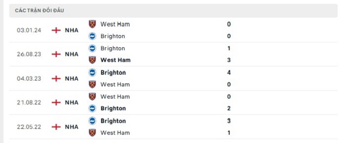 Lịch sử đối đầu của West Ham United vs Brighton